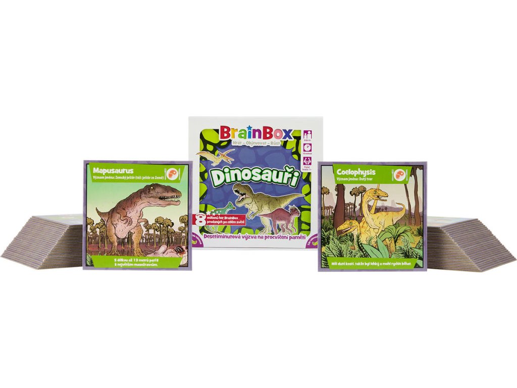 Tato edice hry, věnovaná dinosaurům, vám představí tvory, kteří kdysi dávno vládli světu. Jak vysoký byl brachiosaurus? K čemu sloužil zobák triceratopse? Jaký je význam jména vulcanodon? Hra BrainBox Dinosauři obsahuje 55 hracích karet s ručně malovanými ilustracemi, které vám doslova oživí každou scénu se suchozemskými, mořskými i létajícími dinosaury. Hra pomáhá dětem dozvědět se více o úžasném světě dinosaurů, a přitom rozvíjí kognitivní dovednosti, jako je postřeh a vybavování si vzpomínek, které tvoří základ pro celoživotní vzdělávání.