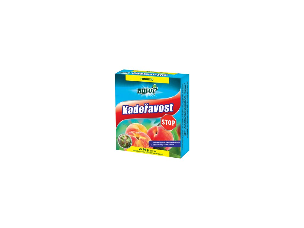 AGRO Kadeřavost STOP je fungicid pro dvoufázové ošetření broskvoní proti kadeřavosti. Kadeřavost se projevuje červenými pochyři na listech, ty se zvětšují a dochází ke zkadeření listů; postižené listy usychají a opadávají; může dojít i k napadání letorostů, květů a plodů. Účinný fungicid na nejčastější chorobu broskvoní – kadeřavost. Nejdůležitější je zasáhnout včas a úroda bude zachráněna.