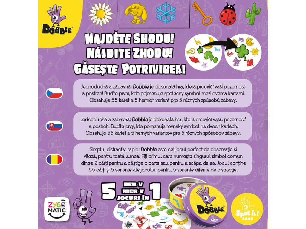 Rychlost, postřeh, reflexy! Buďte první, kdo najde shodný symbol na dvou kartách! Hra nabízí zcela unikátní zábavu. Hráči zde hledají dva stejné symboly na kartách při různých verzích hry (v pravidlech je popsáno celkem 5 her). Super jsou kulaté karty i jednoduchá pravidla, vysvětlená doslova za pár sekund. Plechová krabička zaručuje bezpečí karet a jednoduše umožňuje mít hru vždy u sebe. Vyzkoušejte i vy postřehový fenomén Dobble a jistě budete překvapeni, jak i tak jednoduchá hra může být zábavná!