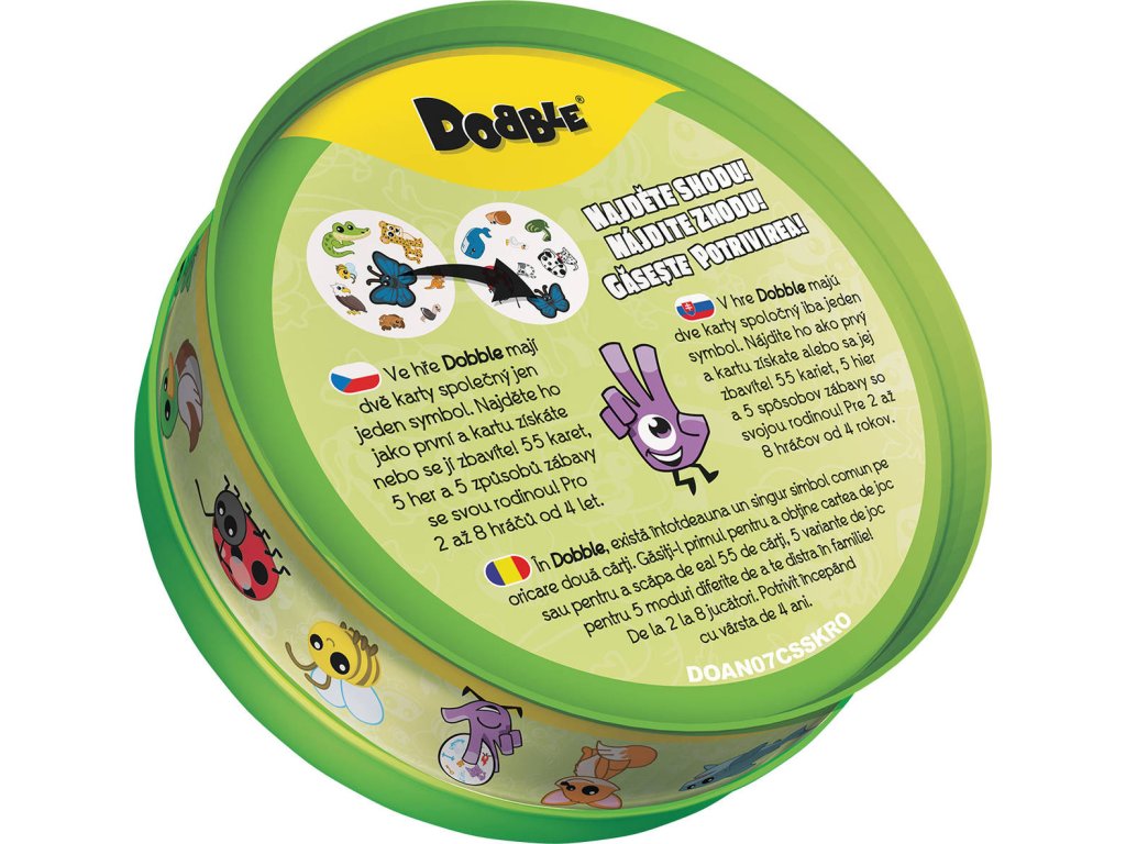 Hráči zde hledají dva stejné symboly na kartách při různých verzích hry (v pravidlech je popsáno celkem 5 her). Super jsou kulaté karty i jednoduchá pravidla vysvětlená doslova za pár sekund. Plechová krabička zaručuje bezpečí karet a jednoduše umožňuje mít hru vždy u sebe. Vyzkoušejte i Vy postřehový fenomén Dobble a jistě budete překvapeni, jak i tak jednoduchá hra může být zábavná a zároveň naučná!