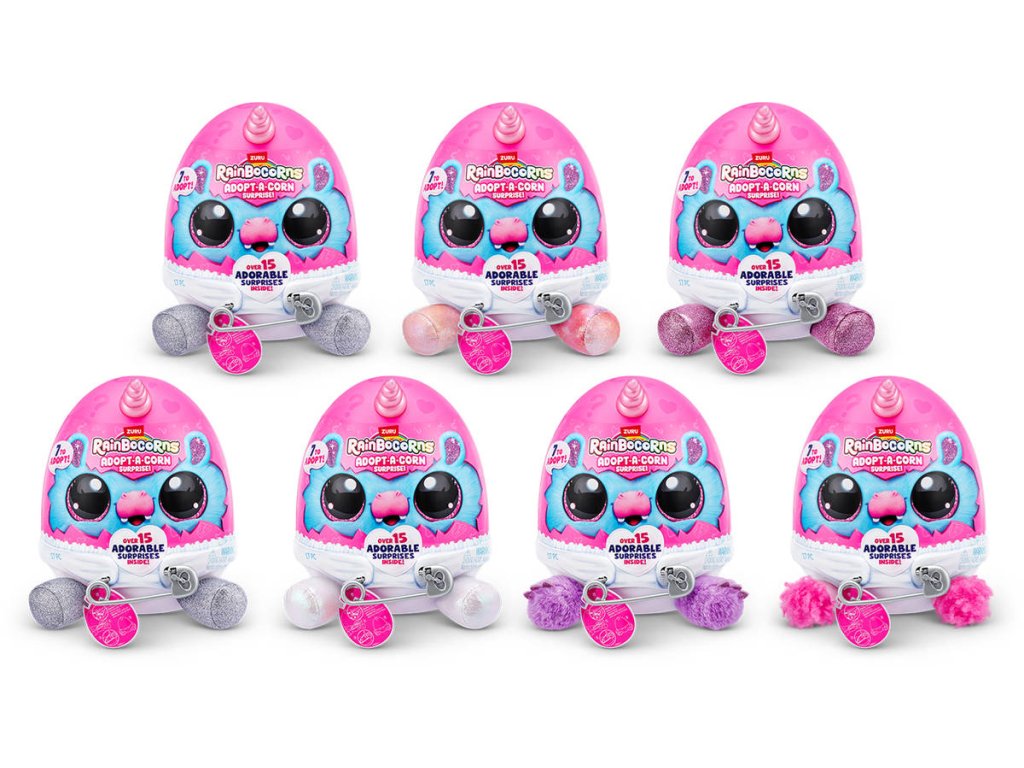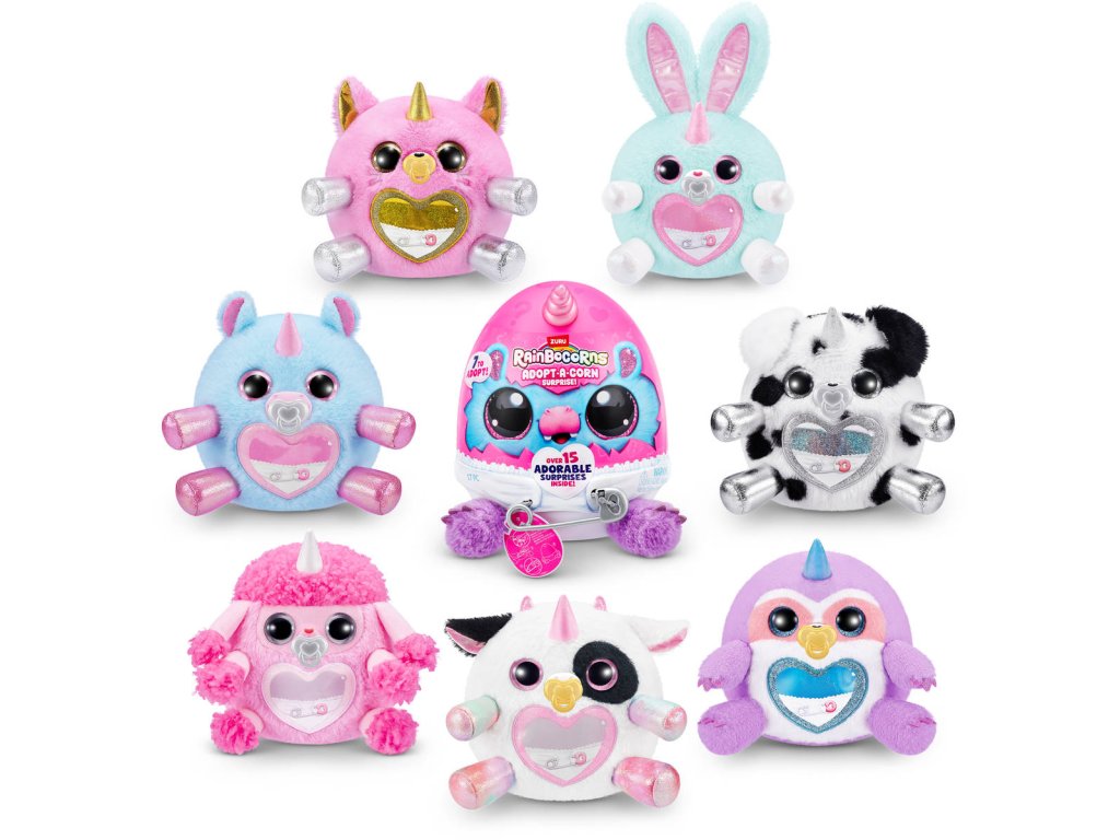 Rainboborns: Adopt-A-Corn. Malé plyšové zvířátko miminko s překvapením ve vajíčku. Součástí 15 doplňků. 7 variant provedení.