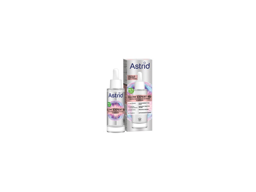 Astrid Glow Expert 4D pleťové sérum je navrženo pro boj proti vráskám a tmavým skvrnám a obsahuje 92 % složek přírodního původu. Vysoce koncentrované složení se silným rozjasňujícím a anti-aging komplexem nabízí 4 účinky pro zlepšení textury a vzhledu pleti. Rovnoměrný tón pleti a redukce tmavých skvrn jsou dosaženy pomocí niacinamidu, jednoho z nejúčinnějších antioxidačních vitaminů, a kyseliny tranexamové, vysoce účinné zesvětlující aminokyseliny, která snižuje produkci melaninu. Působení proti vráskám a vyhlazení textury pleti díky bakuchiolu, přírodní alternativě retinolu, kterou lze používat po celý den bez vedlejších účinků retinolu. Prostřednictvím stimulace produkce kolagenu je redukován výskyt jemných linek a vrásek. Antioxidační účinek je podporován vitaminem E, známým antioxidantem, který bojuje proti volným radikálům a poškození buněk.