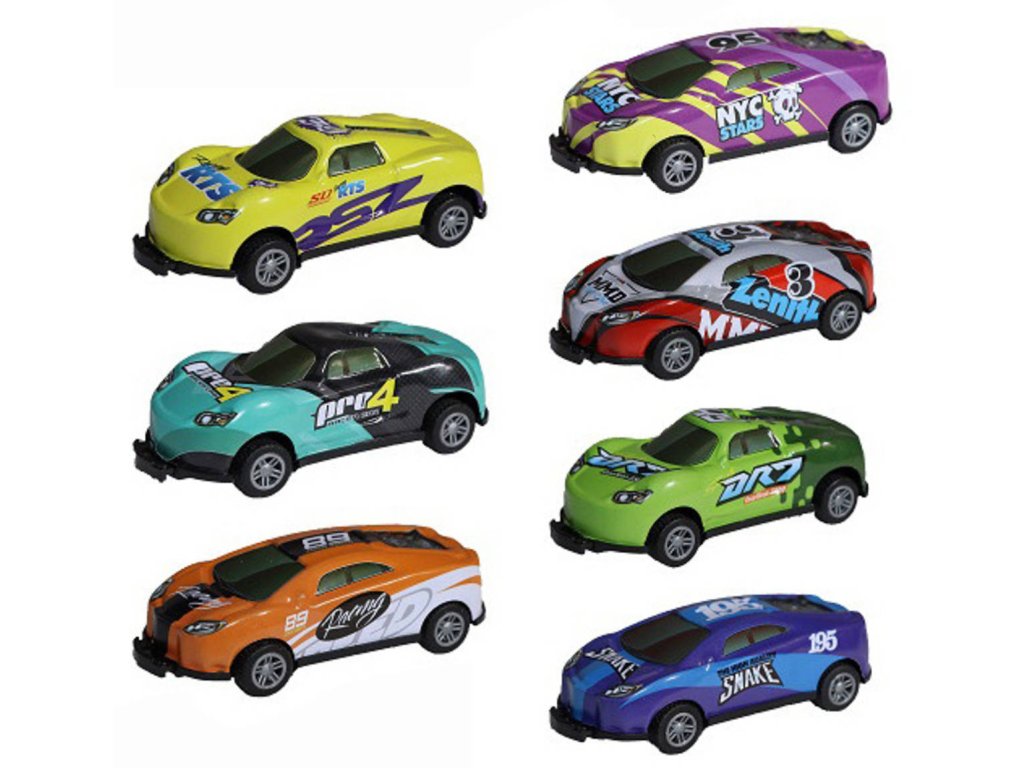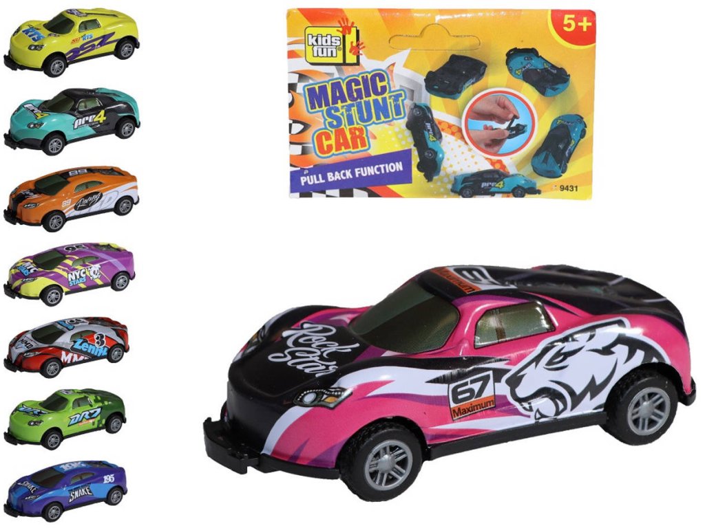 Malé sportovní trikové autíčko závodnička kaskadérská z kovu a plastu, s pohonem na zpětné natažení. Po nárazu do překážky udělá salto. 8 variant provedení.