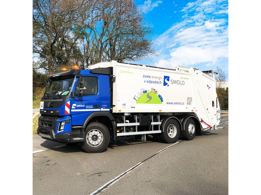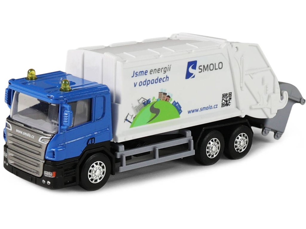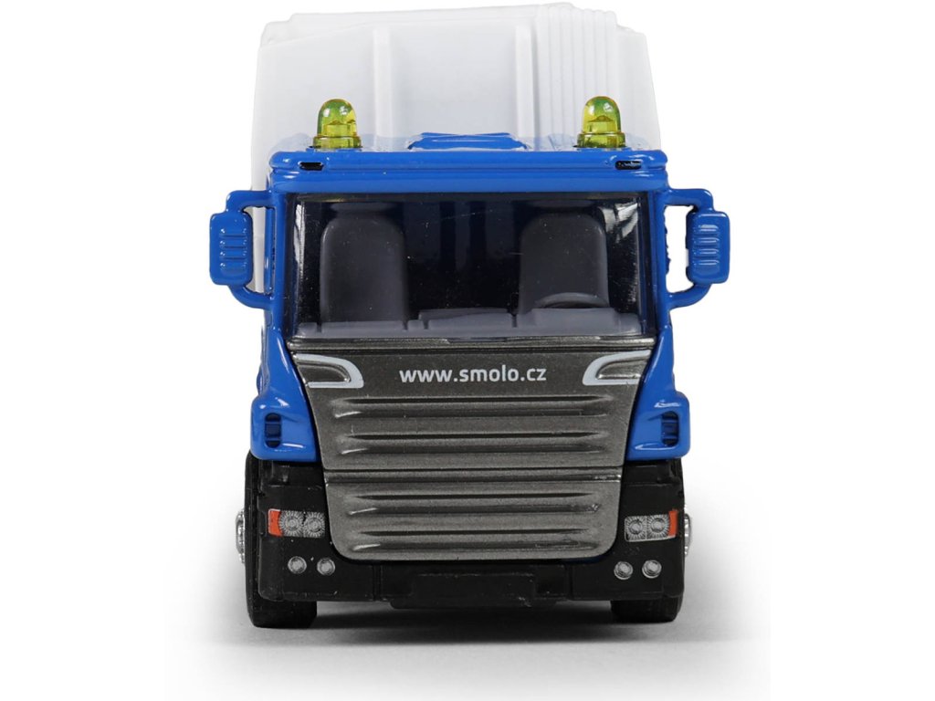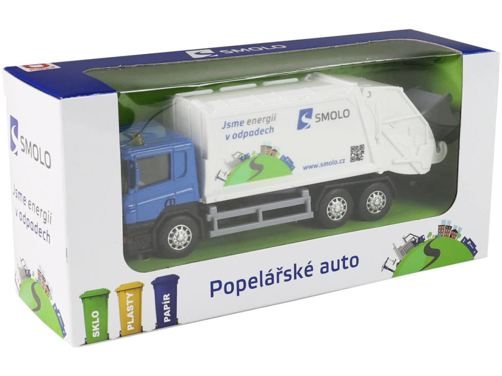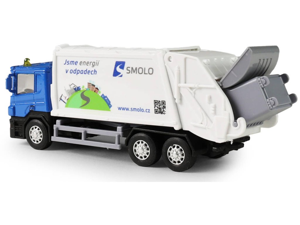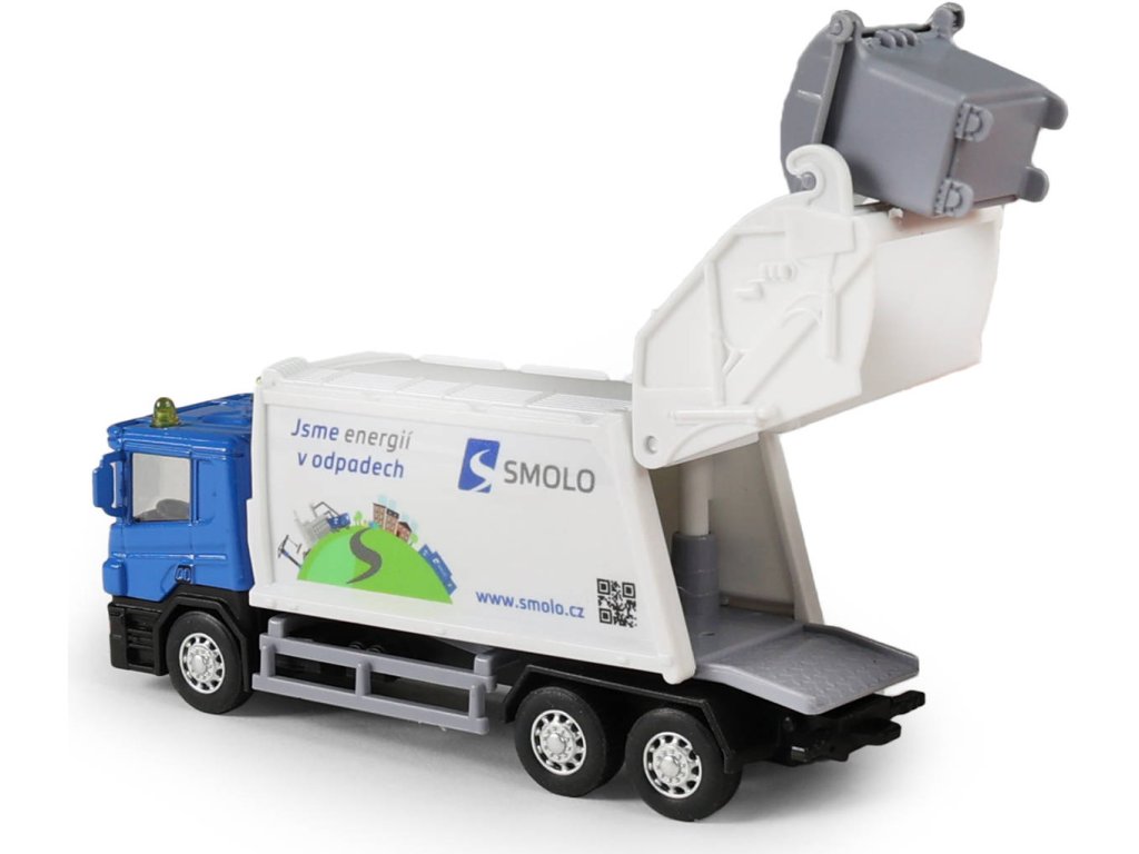 Kovové popelářské auto s plastovou korbou a logem SMOLO. Korba má v zadní části odklápěcí dveře, součástí je otevírací popelnice. Auto jezdí na zpětný chod a jeho délka je 15cm.