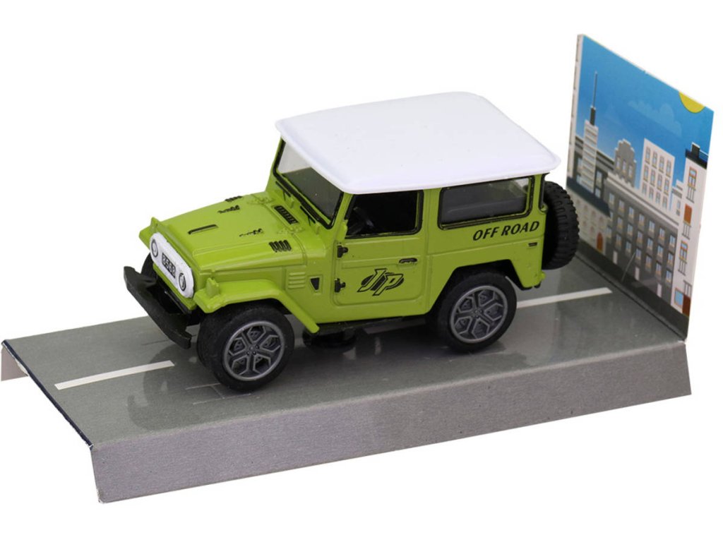 Terénní automobil džíp, model z kovu a plastu, s pohonem na zpětné natažení, autíčko off-road z kolekce "Hrdinové silnic". 4 barevné varianty.