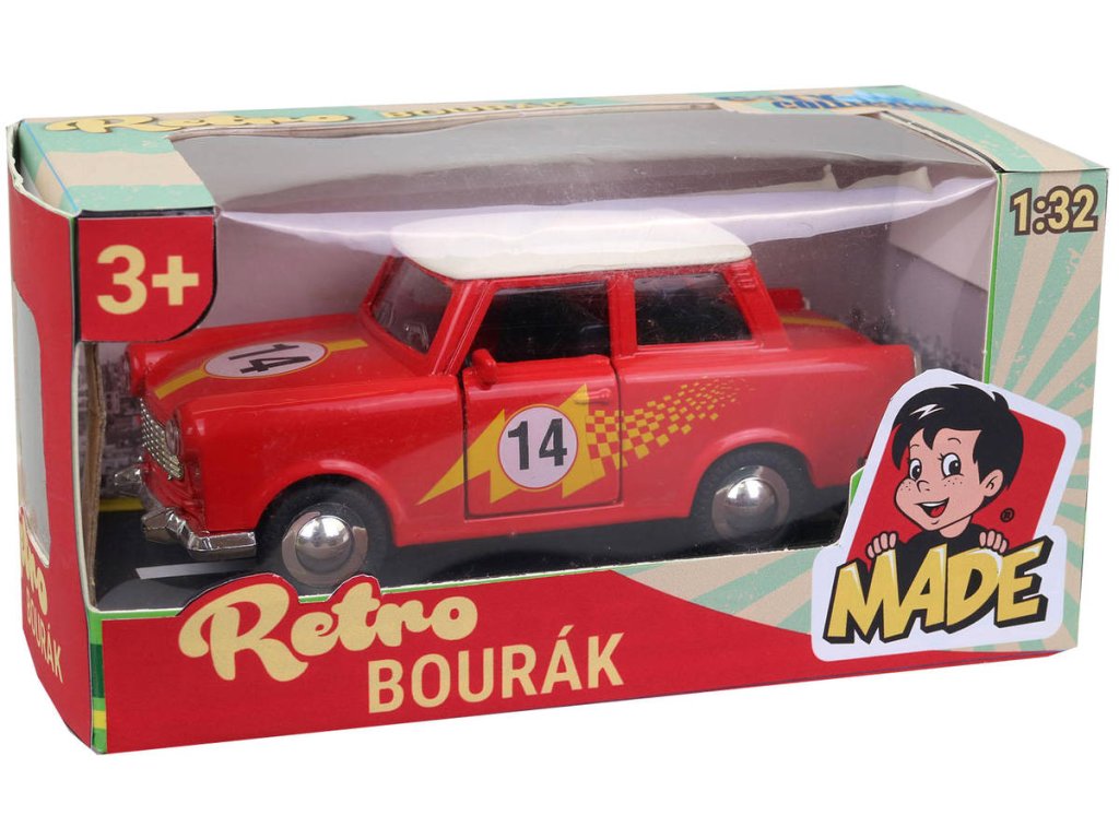 Auto červený kovový trabant, retro bourák - model z kovu a plastu, s číslem závodníka, pro všechny sběratele autíček a fandy do aut. Dveře lze otevřít, pogumovaná kolečka, měřítko 1:32.