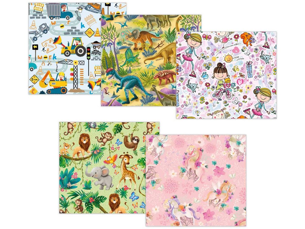 Balící dárkový papír set 2 archy 100x70cm dětské motivy role 5 druhů