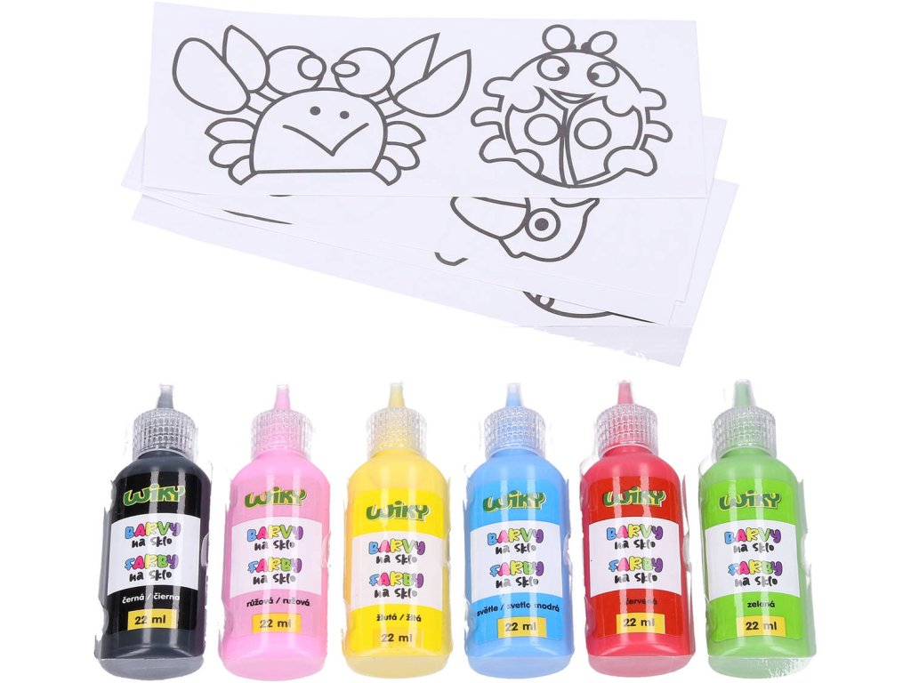 Obsah balení: 5 barev (růžová, zelená, modrá, červená, žlutá) 5x 22ml, kontura černá 22ml, 2 fólie, šablonové obrázky