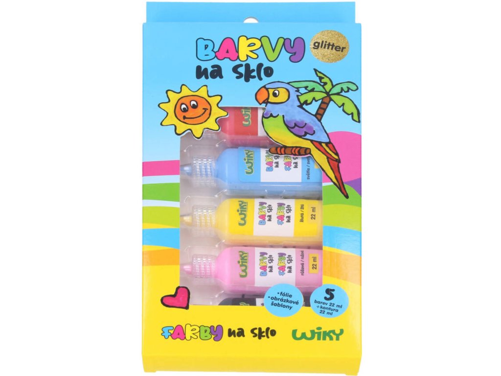 Barvy na sklo glitter se třpytkami set 5x 22ml + černá kontura se šablonami