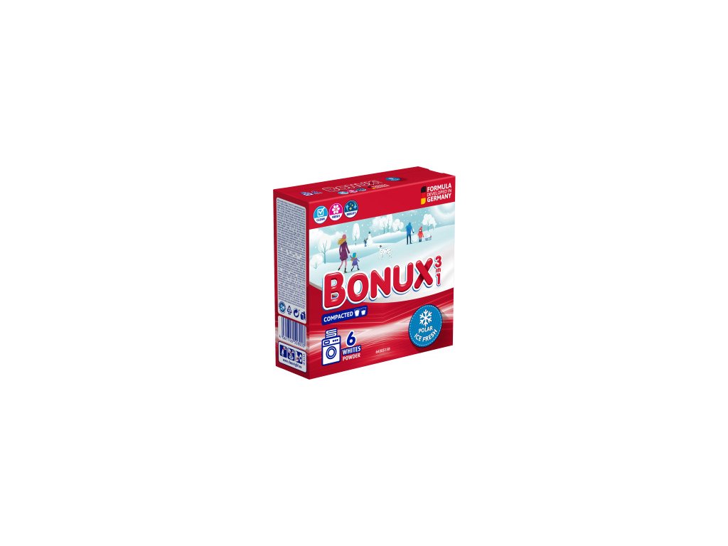 Bonux 3v1 s jedinečnou svěží vůní je určený na bílé prádlo. Prací prášek Bonux White Polar Ice Fresh je chytrý výběr za fantastickou cenu. Dostanete dobrou prací sílu a svěží vůni, jakou byste čekali jen od těch nejlepších a nejdražších pracích prostředků. Obsahuje aktivní částice pro dokonalé praní a složku zabraňující usazování vodního kamene, můžete prát při teplotách od 30 °C. Nepoužívejte na vlnu a hedvábí.