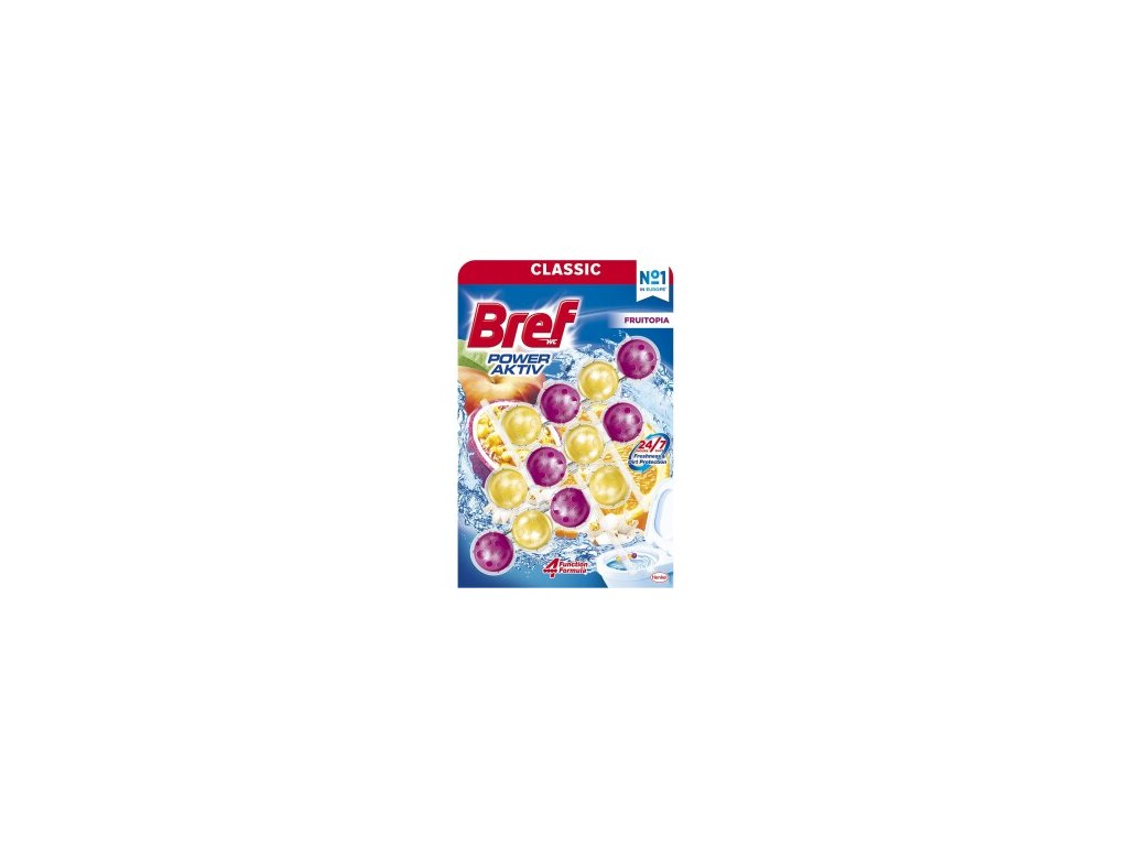 Bref Power Aktiv Fruitopia je závěsný WC blok složený ze čtyř aktivních kuliček v košíčku. Je navržen tak, aby udržoval toaletu čistou při každém spláchnutí, zamezoval usazování vodního kamene a poskytoval dlouhotrvající svěží vůni. Ovocný motiv „Fruitopia“ dodává aroma, které provoní koupelnu a přispívá k příjemné atmosféře.