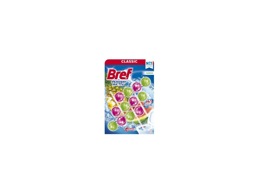 Bref Power Aktiv Hawai je inovativní WC blok ve formě čtyř kuliček, které se postupně rozpouštějí a uvolňují čisticí složky při každém spláchnutí. Díky svému složení poskytuje efektivní čištění, ochranu proti vodnímu kameni a dlouhotrvající svěžest s vůní tropického květu ibišku.