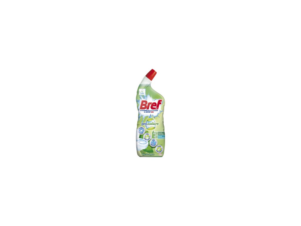 Čistič toalety Bref Pro Nature je přípravek proti vodnímu kameni s 90 % přírodních látek pro aktivní čištění s vůní Máty a Eukalyptu inspirovanou přírodou pro speciální svěžest. Láhev je vyrobena z 50 % recyklovaného plastu. Přírodní složení - Bref Pro Nature gelový WC čistič obsahuje 99 % přírodních složek a nabízí silný čisticí výkon se sníženým dopadem na životní prostředí. Čisticí síla - Bref ProNature aktivně čistí vaši toaletu díky složení proti vodnímu kameni s 99 % přírodních látek, čisticí pěně a účinnému odstraňování nečistot s vůní máty a eukalyptu pro extra svěžest.