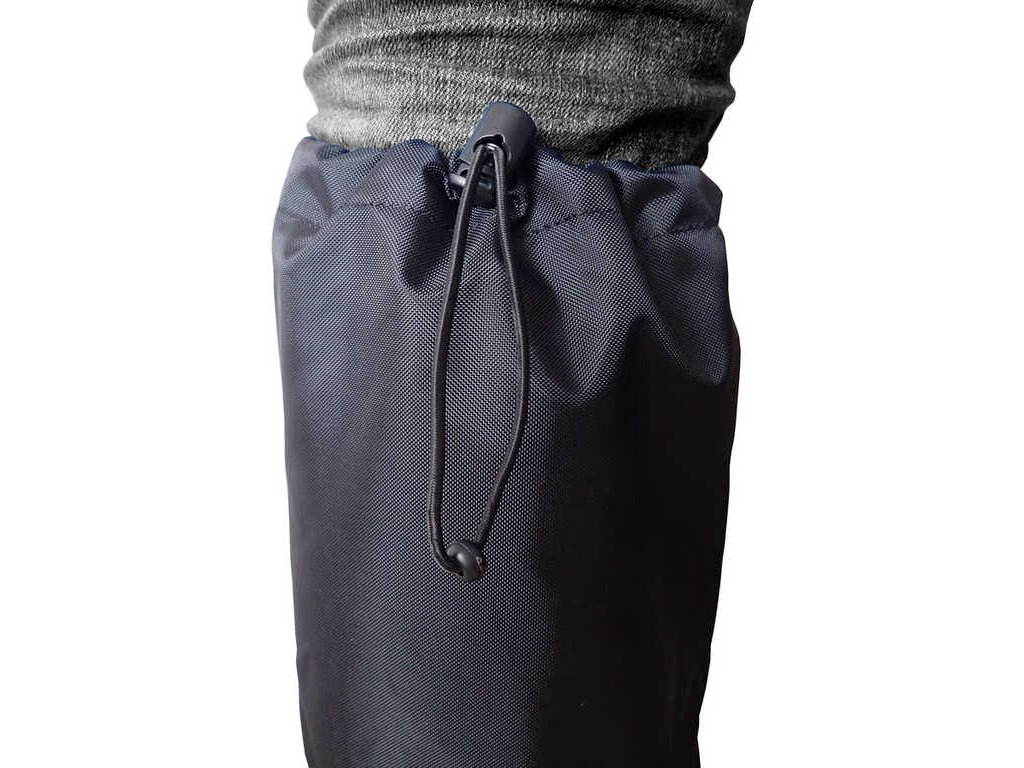 stahovací gumy na spodní straně na botách a nad kotníkem a jednu stahovací šňůru, kterou se návlek upevní na lýtko nohou podle potřeby. Navíc má návlek z boku silný zip pro možnost nasazení na
