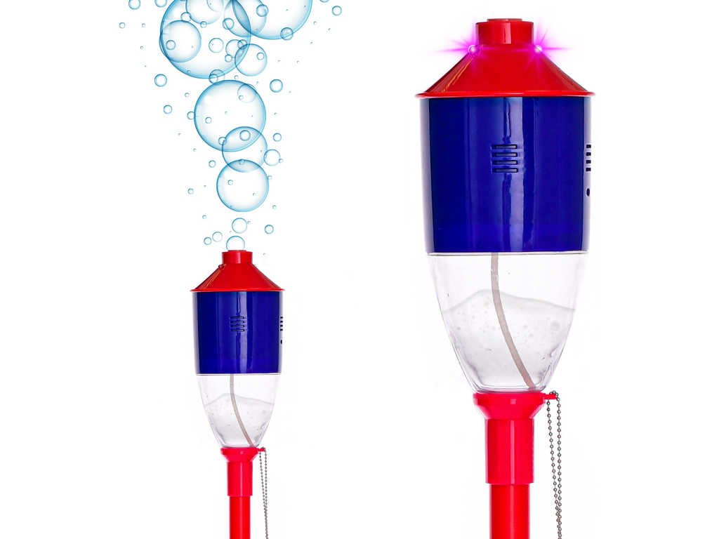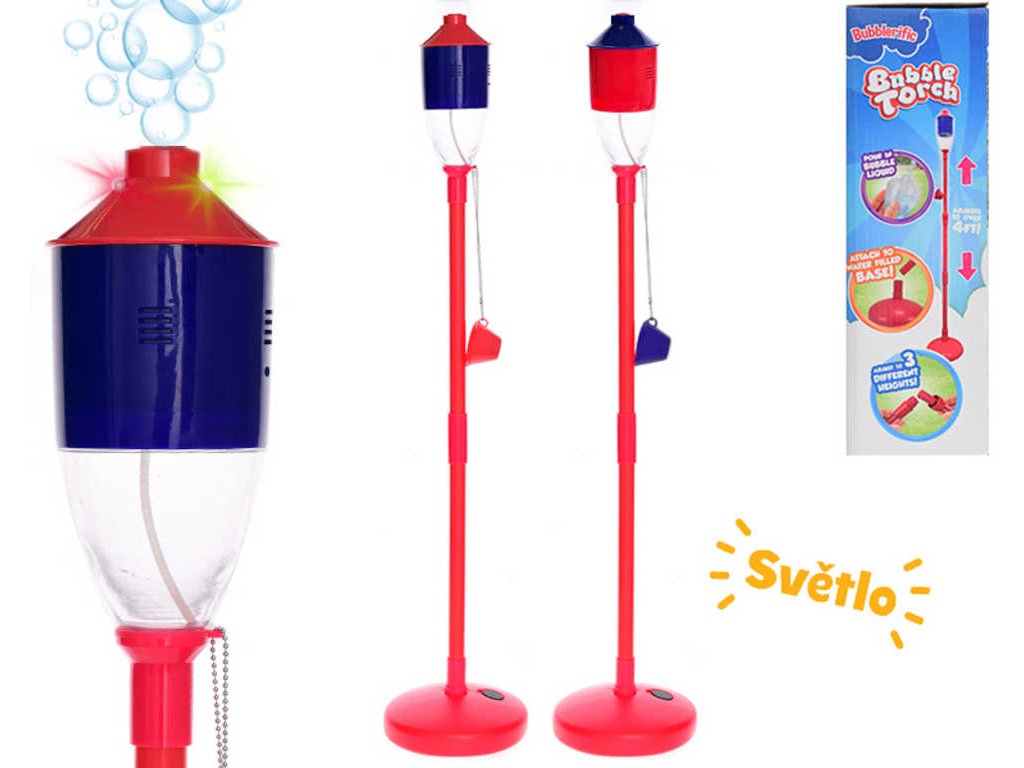 Originální venkovní stojanový bublifukovač na baterie, v podobě sestavitelné louče. Ideální jako doplněk k bazénu na letní párty. Balení obsahuje louč k sestavení a náplň do bublifuku. Jednoduché sestavení dle přiloženého návodu nebo videa níže. Baleno v krabici. Hračka na baterie, se světlem.