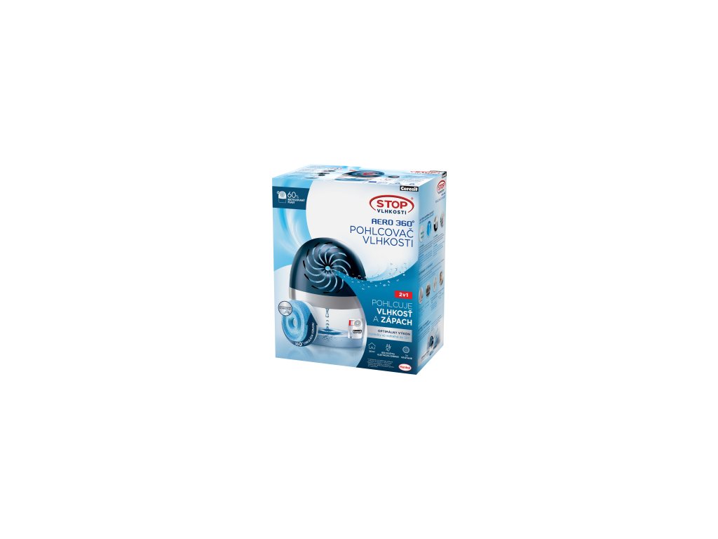 Pohlcovač vlhkosti Ceresit STOP vlhkosti Aero 360° napomáhá optimalizovat nadbytečnou vlhkost ve vzduchu a neutralizuje pachy prostřednictvím proudění vzduchu.