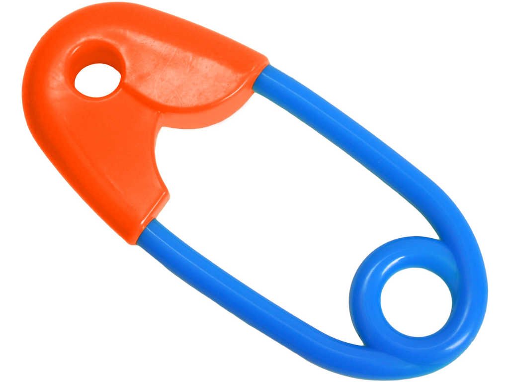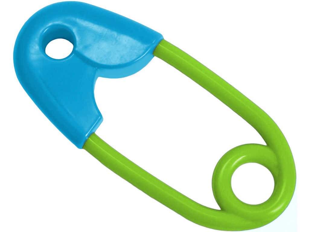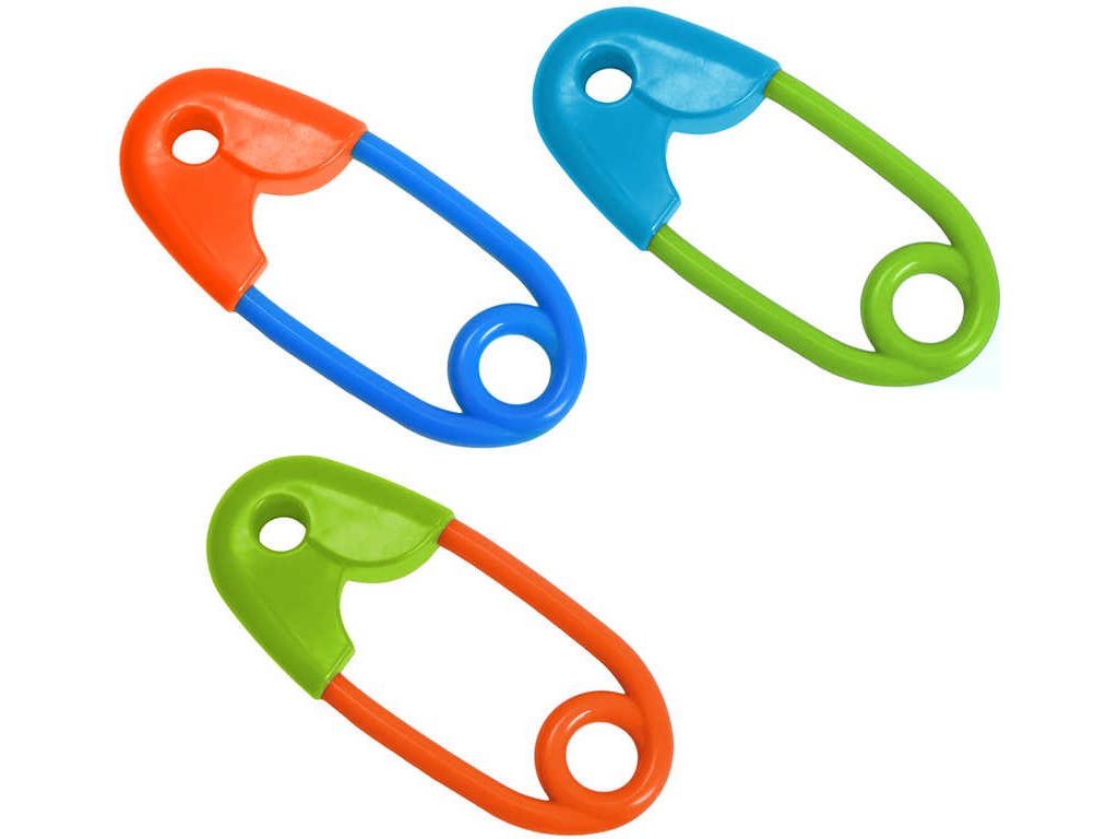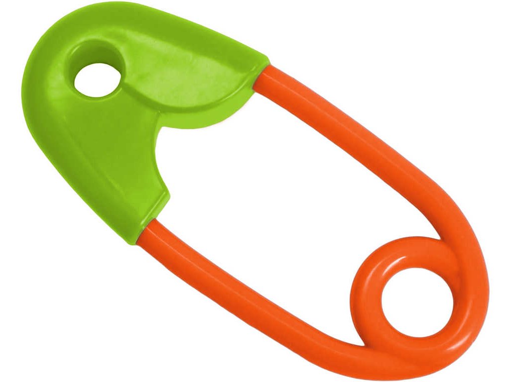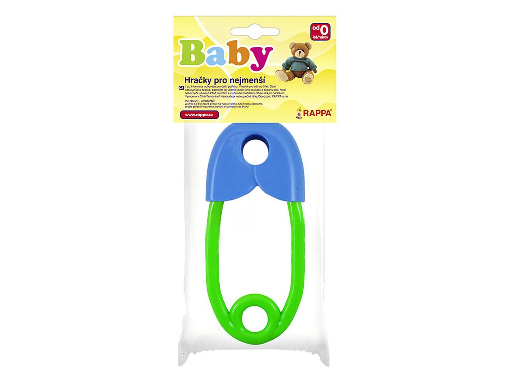 Chrastítko barevný špendlík 12cm pro miminko 1ks v sáčku 3 barvy plast