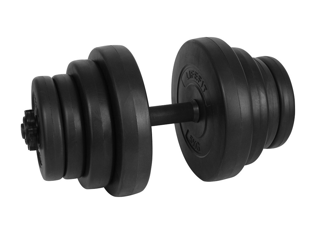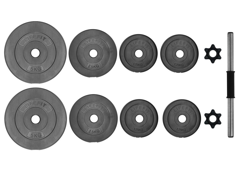 Činkový nakládací set LIFEFIT HARD 20kg je unikátní a cenově dostupný set nakládací činky s cementovou náplní. Kotouče činky jsou vyrobeny z plastu plněného cementovou výplní. Osa činky je vyrobena z vysoce kvalitního kovového materiálu. Osa činky je o průměru 30mm jakožto běžného evropského standardu. Rukojeť je z tvrzeného plastu s protiskluzovou úpravou. Bezpečné upevnění zajištují závity na obou koncích osy a dvě plastové objímky. Činkový nakládací set LIFEFIT HARD 20kg díky vysoké variabilitě umožňuje mnoho druhů cvičení všem výkonnostním kategoriím uživatelů.