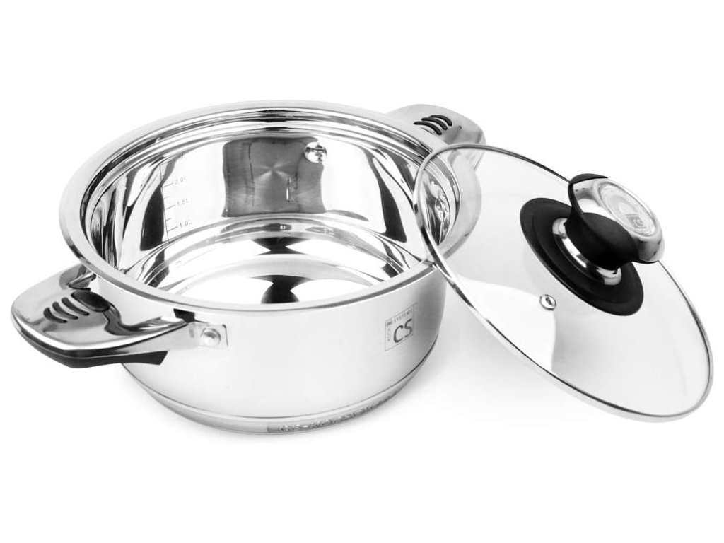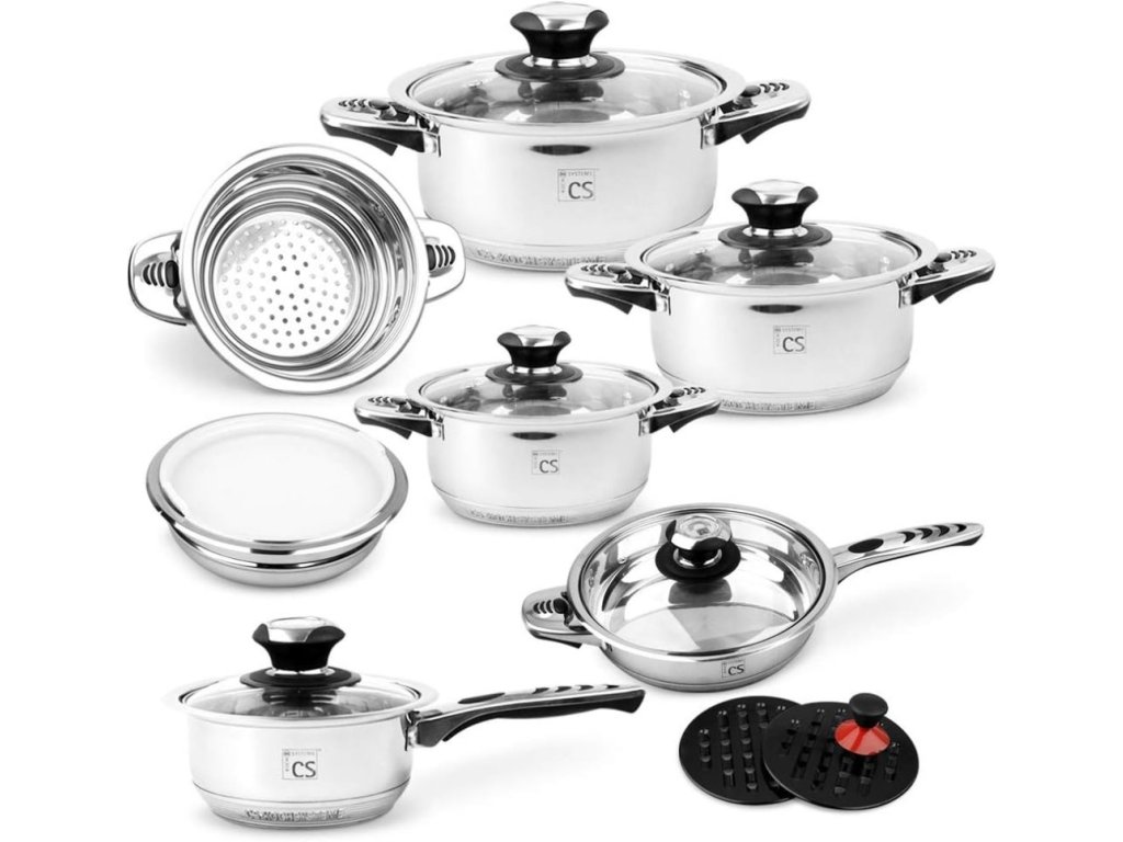 - materiál: prvotřídní nerezová ocel- kvalitní sendvičové dno pro rychlé a úsporné vaření- žáruvzdorné poklice s nerezovou rukojetí- nerezové rukojeti se nezahřívají, zůstávají vždy chladné- teploměry v úchytkách poklic, vynikající pomocník pro zdravé vaření- rychlý ohřev jídla a výborné termoakumulační vlastnosti- pánev se speciálním povrchem s efektem grilu- vhodné na všechny druhy sporáků včetně indukce- vhodné do myčky nádobí bez poklic- sada 16 ks obsahuje:- rendlík s poklicí 16 x 8 cm / 1,6 l- kastrol s poklicí 16 x 8 cm / 1,6 l- kastrol s poklicí 20 x 10 cm / 3,1 l- hrnec s poklicí 24 x 14 cm / 6,3 l- pánev hluboká s poklicí 24 x 6,5 cm / 2,9 l- servírovací pánev / pekáč 20 cm- pařák 20 cm- 2x odkládací podložka pod nádobí- přísavka