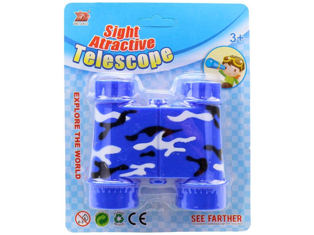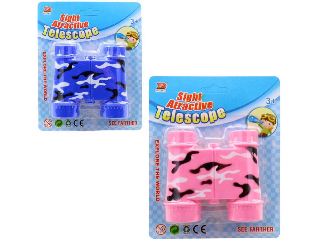 Barevný dalekohled pro děti s maskovacím potiskem, plastový, dvě barevné varianty. Baleno na kartě.