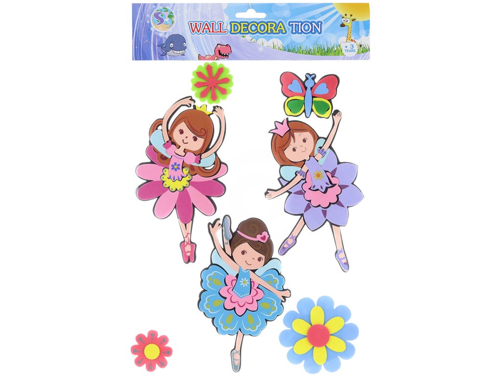 Nalepovací pěnová dekorace k aplikaci na stěnu, dětské motivy (víly, kvítky, motýlek). Sada obsahuje 7 obrázků.
