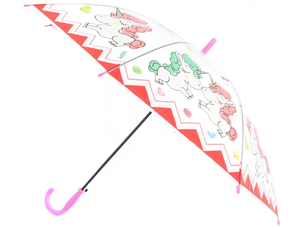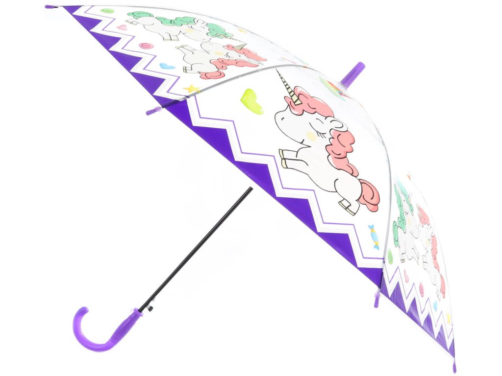 Automatický průhledný holčičí deštník s motivy jednorožců, ve třech barevných variantách. Baleno v igelitovém sáčku.