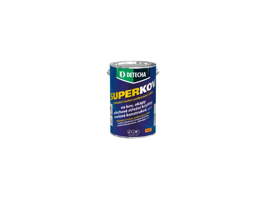 Základní i vrchní antikorozní syntetická barva na kov určená k povrchové úpravě kovových materiálů a k jejich účinné ochraně proti vzniku koroze. Vytváří vysoký bariérový efekt proti trvalému působení povětrnostních vlivů a slunečního záření. K dlouhodobé ochraně (až 8 let) postačí 2 - 3 vrstvy Superkovu bez předchozího základního nátěru. SUPERKOV je základní i vrchní antikorozní nátěr na kov, plechové střešní krytiny, ocelové konstrukce, okapy apod.