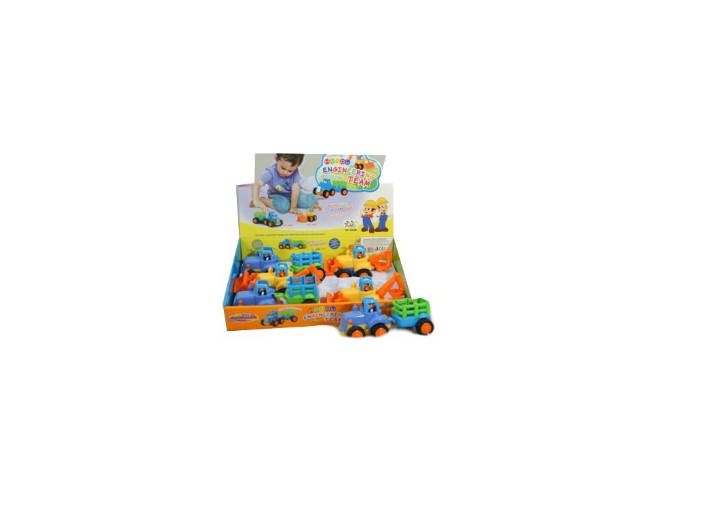 Pěkné barevné pracovní autíčko z plastu pro všechny malé stavitele, zemědělce či farmáře, na pole, stavbu, či farmu. V provedení jako traktůrek s vlečkou na přepravu hospodářských zvířat, koní apod. nebo jako pracovní stroj, čelní a zadní nakladač se dvěma radlicemi - bagr a buldozer v jednom.