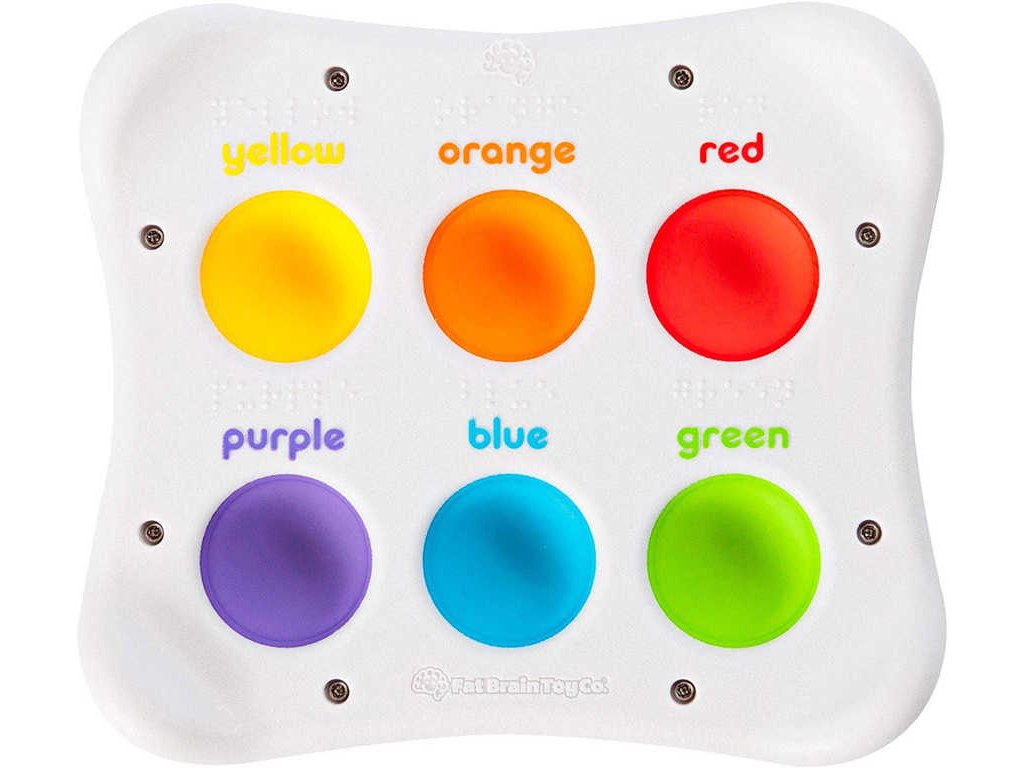 dětských ručiček. V ní je umístěno šest měkkých silikonových polštářků. Každý v jiné, výrazné barvě, jejíž název v angličtině a rovněž i Braillovým písmem je uveden na jedné straně. Když děti polštářky promáčknou,