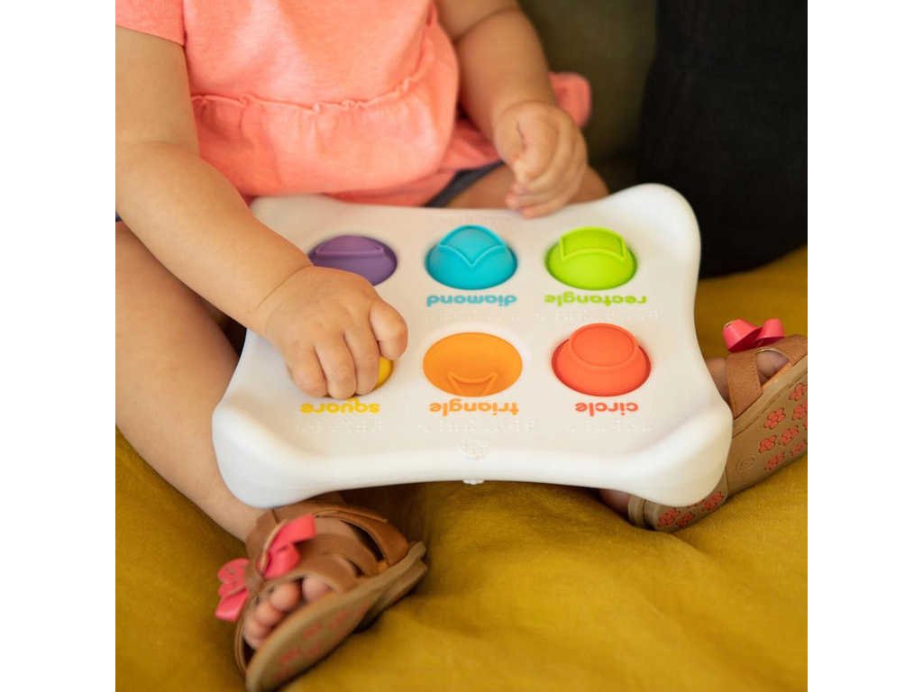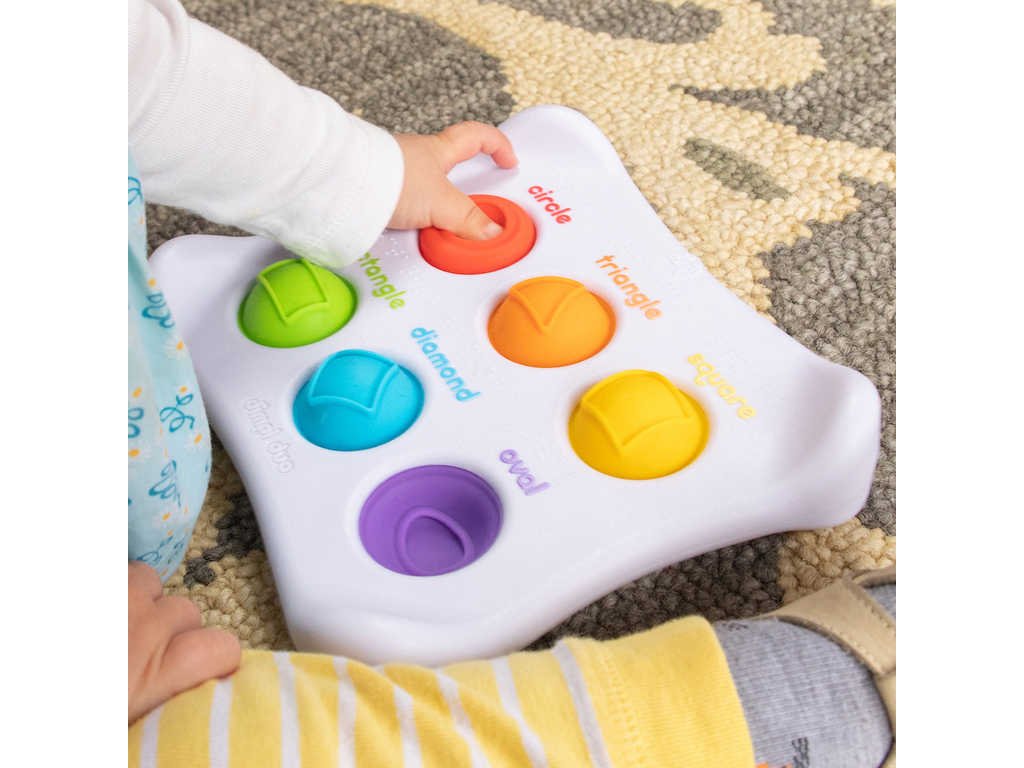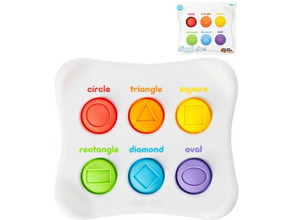 tak na druhé straně pak prozkoumávají rozličné plastické tvary, jejichž název je na hračce opět uveden v anglickém jazyce a Braillovým písmem. Polštářky jsou vyrobeny ze 100% bezpečného potravinářského silikonu.