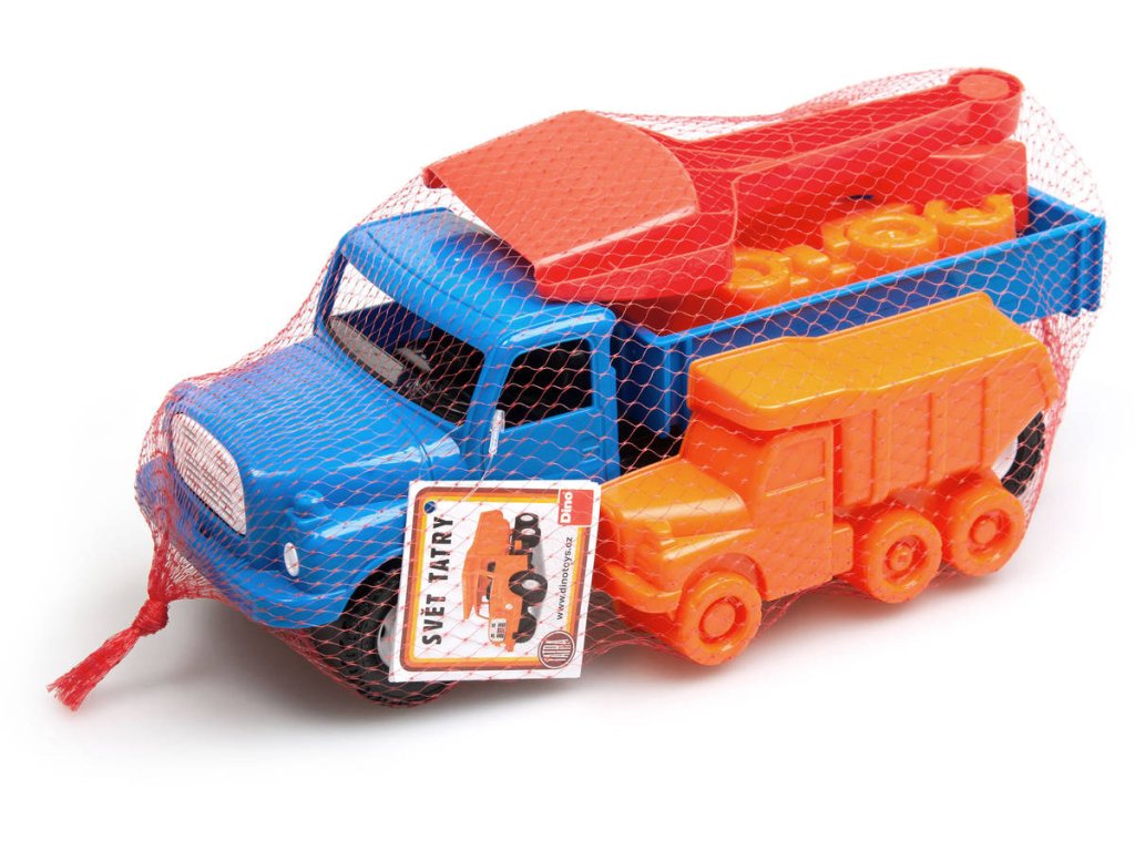 Dino pískový set Tatra, pro nejmenší děti, na písek. Součástí je nákladní 30cm auto Tatra modrá T148 valník, lopatička, hrabičky a 2 formičky.