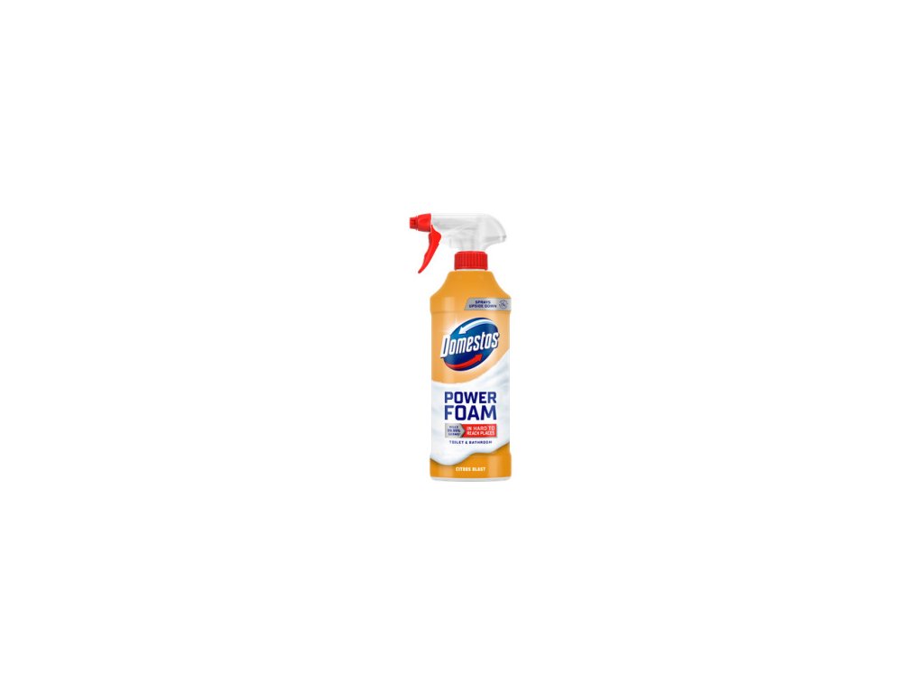 *Eliminuje bakterie jako E. coli, S. aureus, E. hirae, P. aeruginosa a obalené viry, jako je Vaccinia. **Láhev, bez uzávěru, obsahuje 50 % recyklovaného plastu. Domestos Power Foam Citrus Blast Spray je čistič toalet a koupelen, který ničí choroboplodné zárodky* na nejhůře přístupných místech (*bakterie a obalené viry, jako je vakcína).