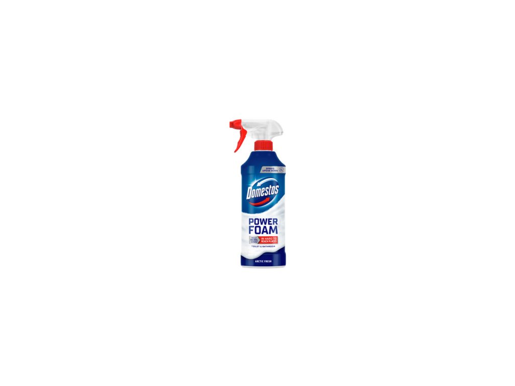 *Eliminuje bakterie jako E. coli, S. aureus, E. hirae, P. aeruginosa a obalené viry, jako je Vaccinia. **Láhev, bez uzávěru, obsahuje 50 % recyklovaného plastu. Domestos Power Foam Arctic Fresh Spray je čistič toalet a koupelen, který ničí choroboplodné zárodky* na nejhůře přístupných místech (*bakterie a obalené viry, jako je vakcína).