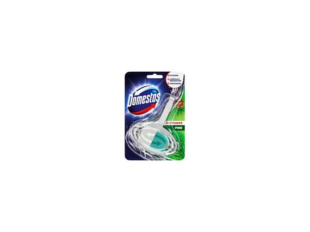 Domestos WC blok 3v1 Pine zanechává vaši toaletu čistou, zabraňuje tvorbě vodního kamene a stará se o dlouhotrvající svěžest s vůní borovice po každém spláchnutí.