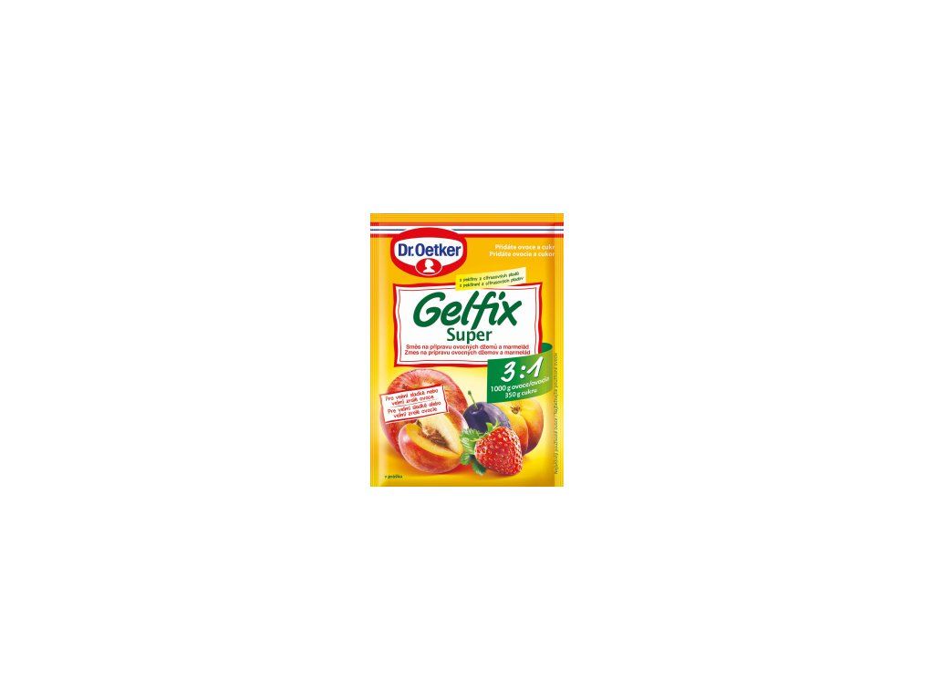 Dr. Oetker Gelfix Super 3:1 želírující přípravek pro zachování velmi výrazné ovocné chuti při použití minimálního množství cukru. Gelfix 3:1 je vhodný pro všechny, kteří chtějí šetřit kalorie a kteří si rádi vychutnají maximální chuť ovoce. Je též vhodný pro diabetiky, neboť normální cukr je možné nahradit umělými sladidly. Jeden sáček vystačí na 1 000 g ovoce a 350 g cukru a vaří se pouze 6 minut. Tento výrobek doporučujeme používat při přípravě džemů s velmi sladkým nebo velmi zralým ovocem. S Gelfixem Super 3:1 bude Váš hotový džem obsahovat až 73% ovoce!