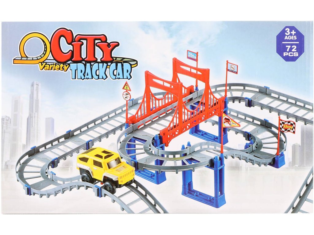 Plastová skládací nadzemní akční dráha s mostem. Součástí auto na baterie. Celkem 72 dílů.