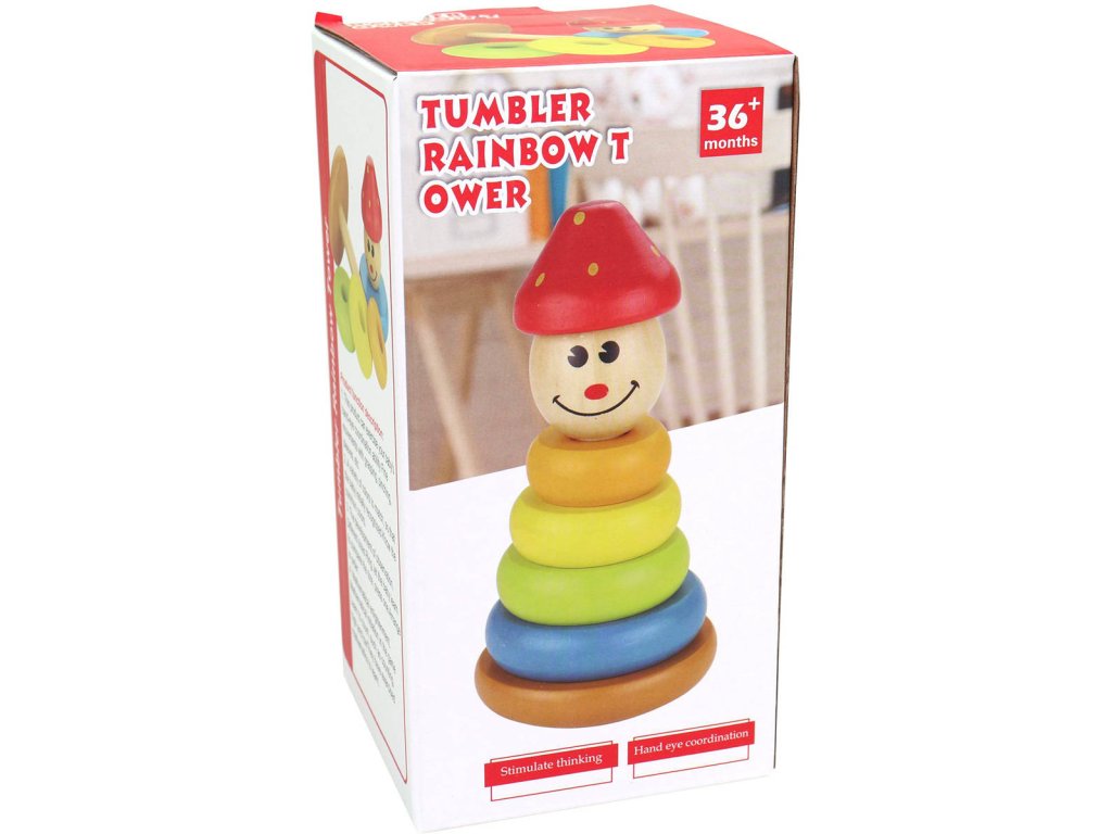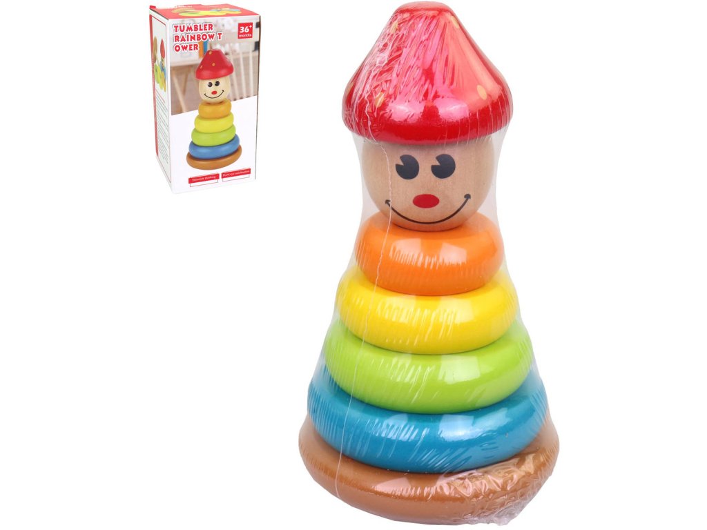 Dřevěná věž, panáček, 17 cm. Dřevěné kroužky, které se podle velikosti umisťují na kolík skvěle procvičí jemnou motoriku a prostorové cítění dětí. Učící věž je ve vzhledu usměvavého panáčka. V průběhu hry se dítě učí i základní barvy.