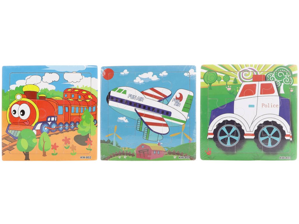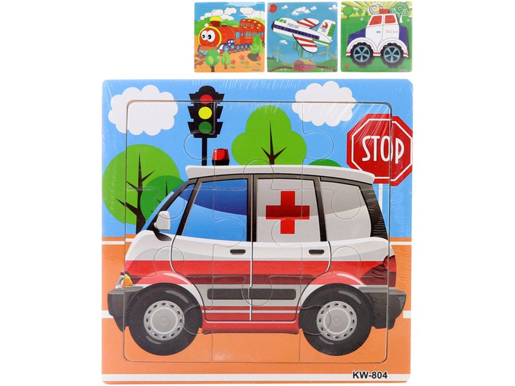 DŘEVO Puzzle dopravní prostředky vkládací na desce 9 dílků 4 druhy