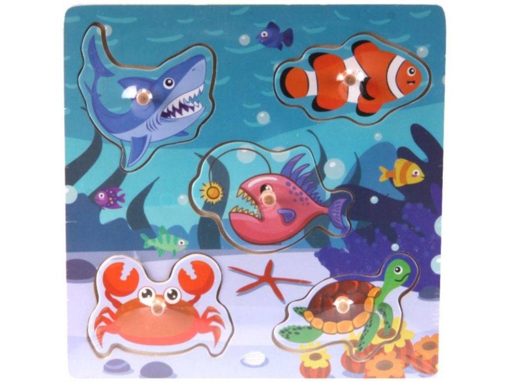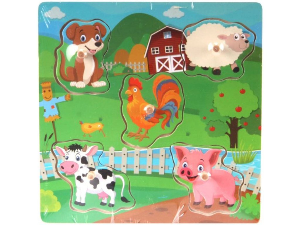 Didaktické vkládací puzzle. Hra učí děti poznávat tvary a pomáhá rozvíjet motoriku rukou. Výrobek splňuje požadavky EU na bezpečnost hraček a je vhodný pro děti od 3 let. Dřevěná vkládačka pro malé děti s úchytkami. Dítě se podle obrysů a tvarů snaží najít správný obrázek (rozvoj představivosti a logického myšlení), a umístit jej do správného otvoru (rozvoj jemné motoriky).