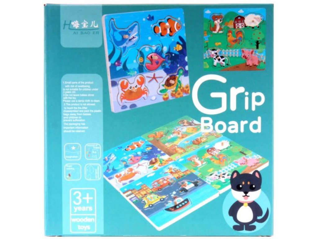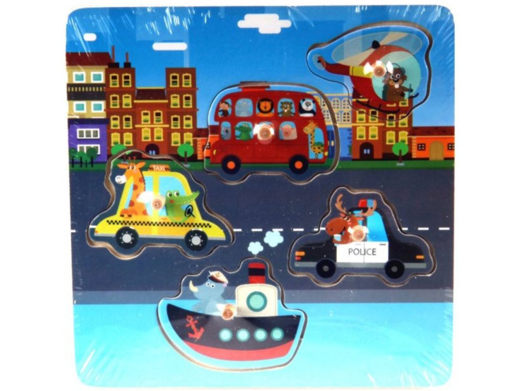 Dřevěné vkládací puzzle na desce, s úchyty. Rozvíjí motoriku dítěte, logické myšlení a soustředěnost. Vkládačka je opatřena úchytkami pro snazší manipulaci. Různé varianty provedení. Zvířátka, dopravní prostředky. 5 dílků.
