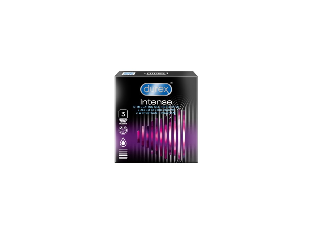 Durex Intense Orgasmic kondomy - stimulační vroubkování a výstupky, s gelem Desirex poskytujícím pocit zahřívání, ochlazení nebo mravenčení.