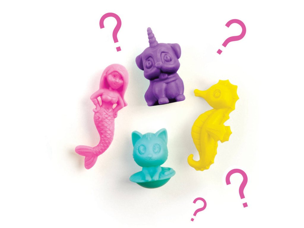 Obsah balení: kelímek s práškem na výrobu fluffy hmoty, sáček s dekoracemi, odměrka, figurka