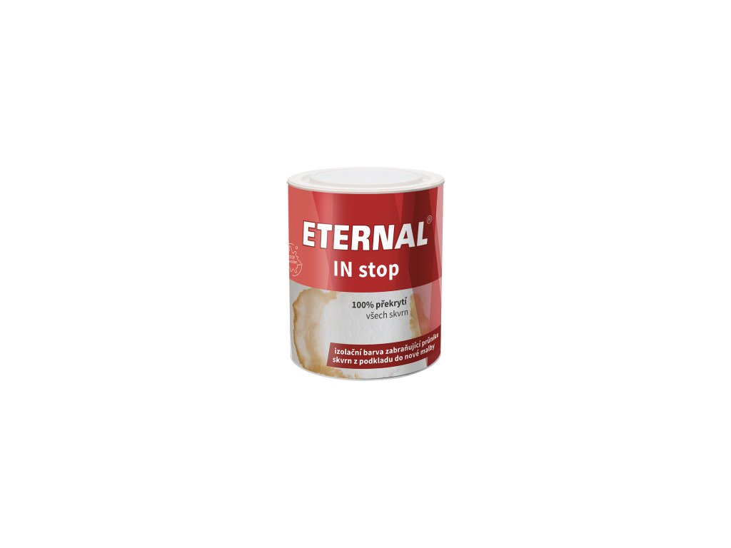 ETERNAL IN stop se používá k základním nátěrům, kterými lze zabránit průniku nikotinových skvrn v silně zakouřených místnostech do nové malby. Dále se dají tímto nátěrem izolovat skvrny po starých válečkových malbách, skvrny po zatékání, rzi, mastnotě, sazích, skvrny vystupující ze dřeva, dřevotřískových desek a sádrokartonů při nátěrech disperzními barvami apod. ETERNAL IN stop je jednosložková vodou ředitelná nátěrová hmota připravená na bázi speciální vodné disperze akrylátových kopolymerů, pigmentů, plniv a speciálních aditiv. ETERNAL IN stop se vyznačuje schopností zabránit průniku zbarvujících látek z podkladu na povrch