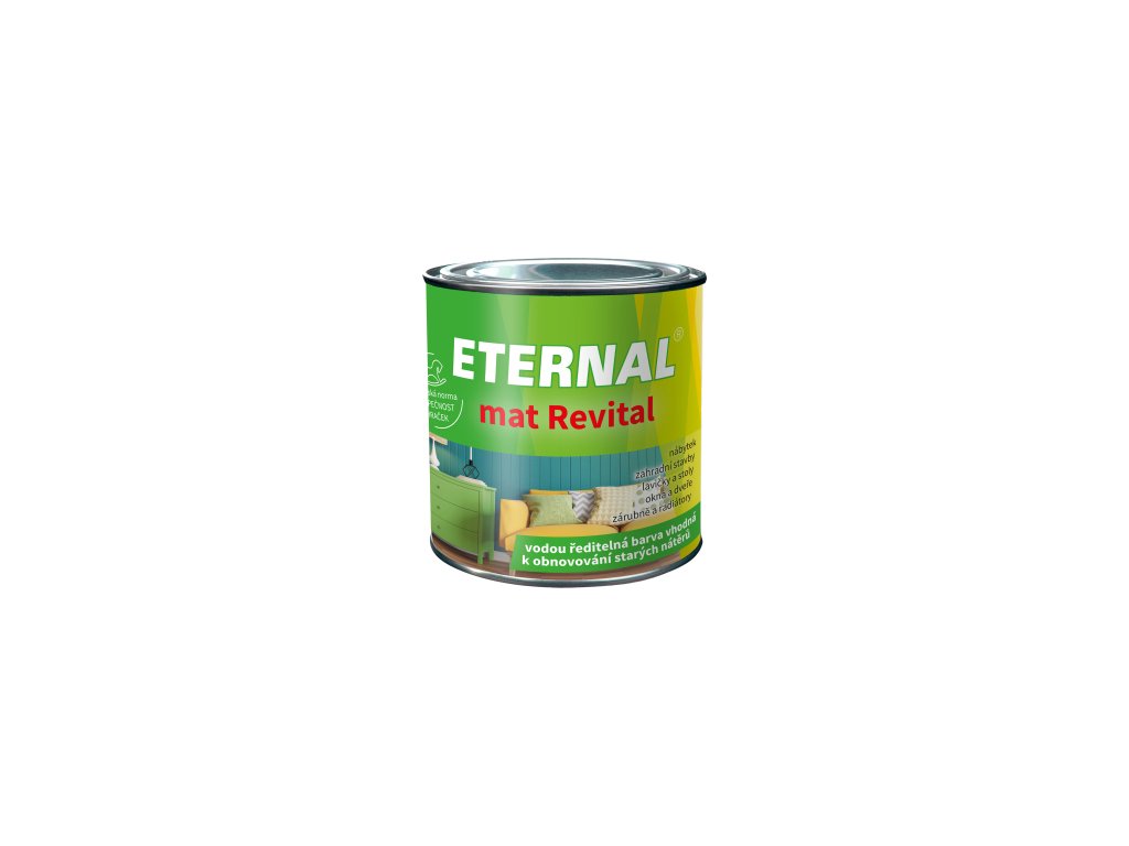 ETERNAL mat Revital je univerzální hedvábně matná vodou ředitelná nátěrová hmota pro vnitřní i venkovní použití připravená ze speciální síťovatelné disperze akrylátových kopolymerů, pigmentů, plniv a aditiv. Tvoří poměrně tvrdé, elastické matné nátěry s vysokou odolností na povětrnosti a ýbornou odolností blokování a to i při vyšší teplotě. Vyznačuje se velmi dobrou kryvostí, dobrým rozlivem, rychlým zasycháním a výbornou přilnavostí i ke starým syntetickým a olejovým nátěrům. ETERNAL mat Revital splňuje podmínky ČSN EN 71 část 3 Bezpečnost hraček Migrace určitých prvků.