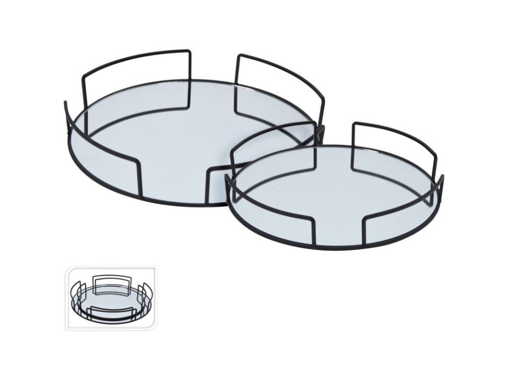 Moderní designová sada 2 ks podnosů.Materiál: kov, sklo (zrcadlo)Průměr velkého 33 cmPrůměr malého 28 cm