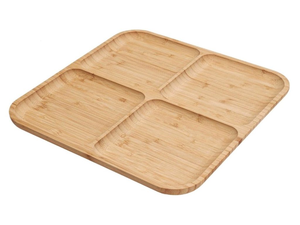 Stylový a ekologický servírovací talíř vyrobený z bambusu (Phyllostachys edulis). Ideální pro podávání různých druhů pokrmů, předkrmů nebo snacků. Díky svým čtyřem přihrádkám umožňuje oddělené servírování jídel.