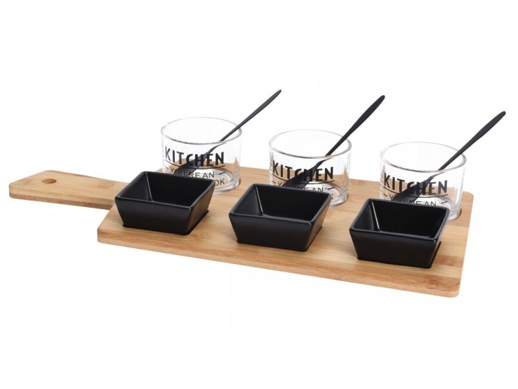 - servírovací set misek a skleniček na tácu pro nejrůznější příležitosti- materiál: kamenina s matnou glazurou / dřevo- podnos z bambusového dřeva s připravenými otvory pro misky, mističky díky tomu drží na místě- perfektní pro servírování sushi, předkrmů, pochutin, dipů a omáček- žáruvzdorné do 200 °C, misky lze využít také k zapékání- vhodné do myčky nádobí- sada obsahuje bambusový podnos, 3 misky, 3 skleničky a 3 lžičky- rozměry tácu: 37 x 17 x 0,6 cm- barva: černá / transparentní / dřevo- značka: Excellent Houseware