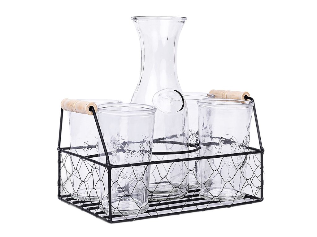 - stylové dekorované skleničky s velkou karafou v praktickém košíku- materiál: silnostěnné sklo- hrdlo karafy i sklenic je dostatečně široké, bez problému do nich lze nalít i ovoce či led- celá sada usazena v promyšleném košíku s dřevěnými rukojeťmi, který slouží zároveň jako stojan i pomůcka pro jednoduché přenášení- sada skleniček na limonádu je vhodná primárně pro studené nápoje, limonády, ledové čaje, džusy, smoothie nebo koktejly- skvělý doplněk na letní akce, zahradní party, oslavy nebo grilování,..- celá sada je vhodná do myčky nádobí, kromě košíku- objem karafy 1 litr- objem skleniček 0,45 litru- rozměry košíku: 30 x 17 cm- kompletní sada 6 ks obsahuje:- 1x karafa- 4x sklenice na limonádu- 1x stojan a košík pro přenášení v jednom