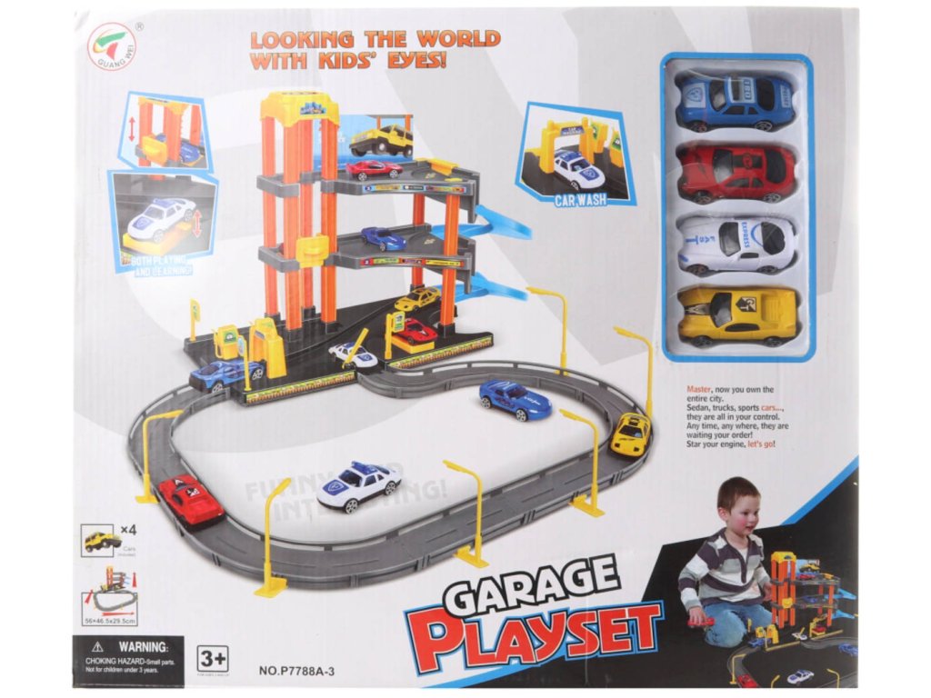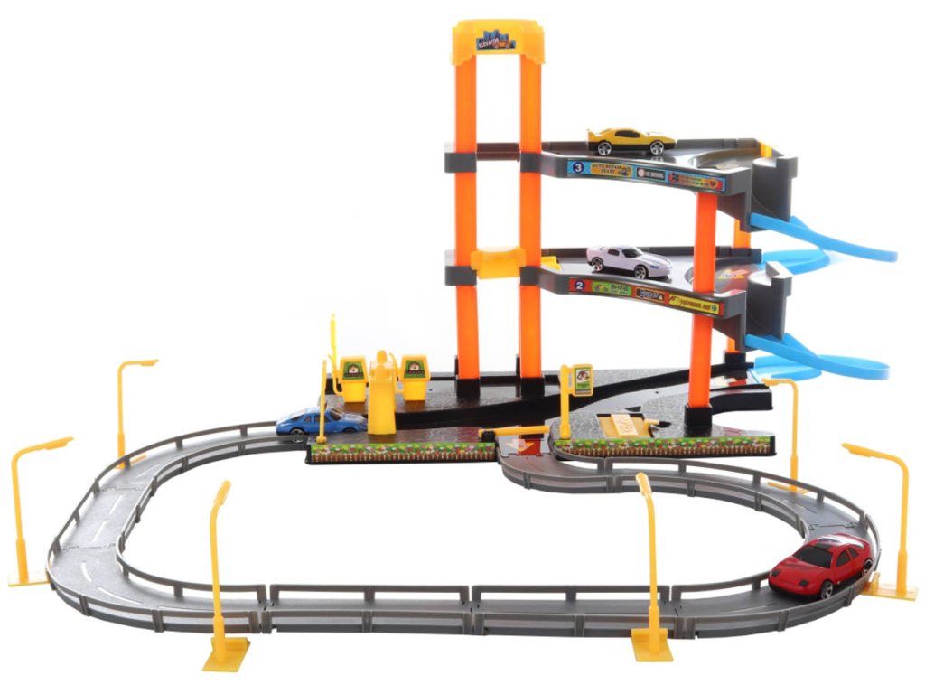 Obsah balení: parkovací dům s dráhou, autíčko 4x, pouliční osvětlení, benzinová stanice