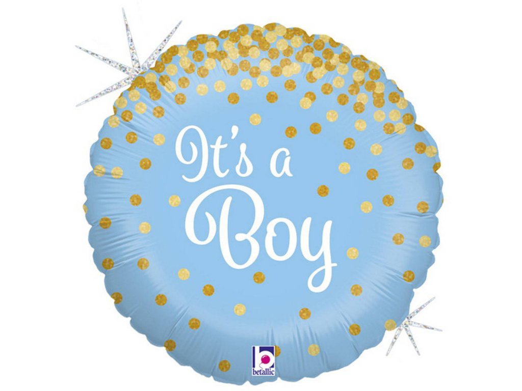 Foliový balónek ve tvaru kruhu v modré barvě s potiskem "Je to kluk" se třpytivými zlatými konfetami. Fóliové balónky jsou vhodným doplňkem výroční, novoroční i narozeninové výzdoby a na oslavy oznámení pohlaví miminka. Balónek je 46cm velký, je vhodný k nafukováním heliem i vzduchem.